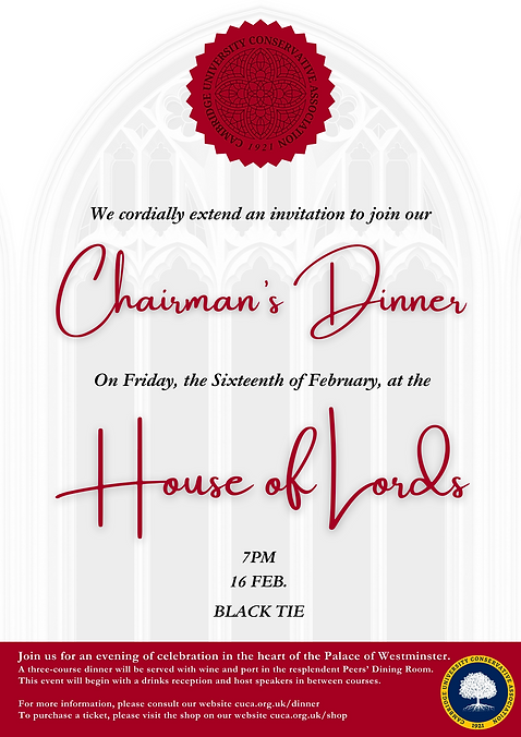 The reputation of banqueting at House of Lords is sublime: truly brilliant food, specially reserved wines, and surroundings in the heart of the mother of parliaments. We will be working our hardest to unite CUCA members from years ago with those of the present day. It is our hope that this evening at the House of Lords will be one of the best moments during our times at Cambridge.